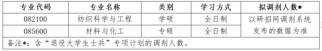 纺织科学与工程学硕、材料与化工专硕面向全国考生接受调剂,调剂公告如下: