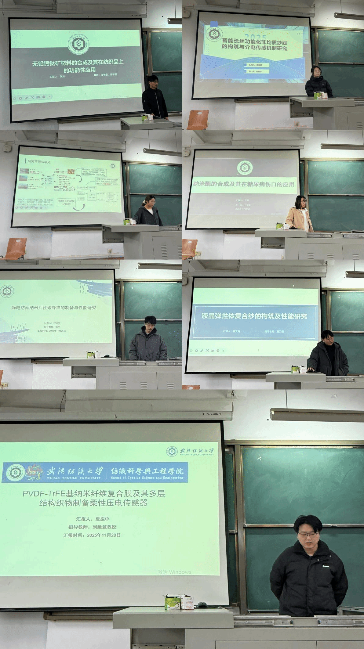 论坛上,张龙、陈双婷、刘小歌、王蕊、郑艺森、黄文海、夏振中七位同学依次介绍了自己的研究课题和目前取得的研究进展,并分享了自己的科研经验。主讲同学的研究课题包括无铅钙钛矿材料的合成及其在纺织品中的功能性应用、智能长丝功能化非均质纱线的构筑与介电传感机制研究、基于氮掺杂碳量子点的纳米纤维荧光膜的制备及其对Cu2+的检测、纳米酶的合成及其在糖尿病伤口的应用、静电纺丝纳米活性碳纤维的制备与性能研究、液晶弹性体复合纱的构筑及性能研究、PVDF-TrFE基纳米纤维膜及其多层结构制备柔性压电传感器,契合了“纺织新材料及绿色加工”主题,代表了学院最新研究进展,参会人员积极提出问题和建议,营造了良好的学术氛围。